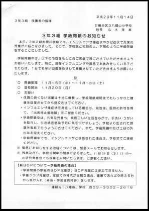 本日、3年3組では、インフルエンザ(風邪を含む)による欠席が多数みられました。これ以上の感染を防ぐため、学校医とも相談した結果、11月15日(水)から18日(土)までの4日間、学級閉鎖を行うことにいたしました。学級閉鎖中は、健康管理、家庭での過ごし方にご配慮をお願いいたします。一日も早い回復をめざして療養してください。