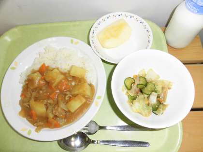 「カレーライス、野菜の中華かけ、りんご、牛乳」です。