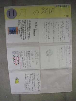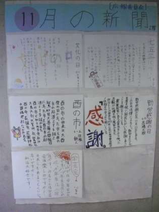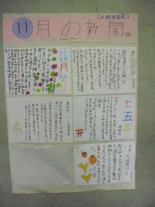 昨日の委員会活動で、広報委員会が作成した11月の新聞が掲載されました。「七五三」・「酉の市」・「勤労感謝の日」などの季節の話題が紹介されています。各フロアに掲示していますので、学校公開期間でご来校の際に、ぜひご覧なってください。