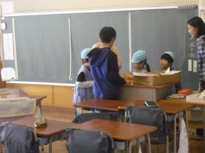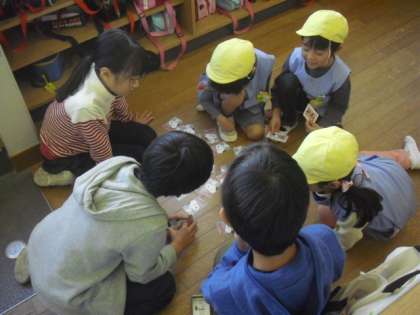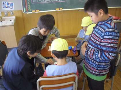 教室では。5年生が折り紙の折り方を教えてあげたり、カードゲームで遊んだりして、しっかり幼稚園の子どもたちを楽しませていました。とても頼りになるお兄さん、お姉さんたちでした。