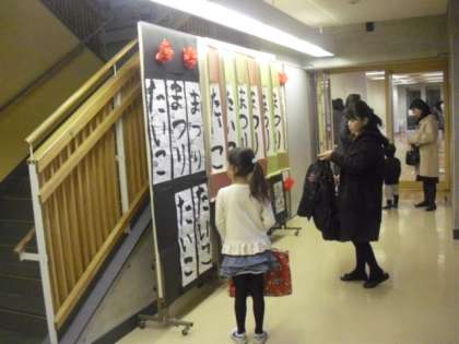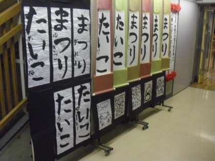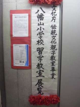 今年度から地域の有志の方々を中心に、文化庁芸術振興費補助金伝統文化親子教室事業の一環として、6月より開催されていました「八幡山小学校 習字教室」が、本日で終了しました。子どもたちの作品が掛け軸になって、ランチルーム前に展示されました。その他の作品も掲示され、どれも1・2年生の作品とは思えない、とても素敵なものばかりです。