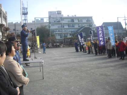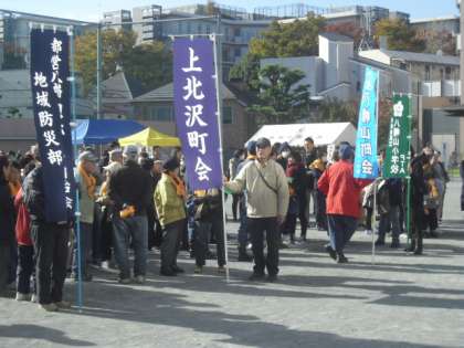 秋晴れの晴天の下、上北沢と八幡山に居住している方々を対象とした、上北沢地区防災訓練が、今年度は上北沢小学校を会場にして行われました。上北沢地区防災訓練実行委員会の主催の下、上北沢1丁目自治会、上北沢町会、八幡山町会、日赤奉仕団、世田谷消防署、成城消防署、上北沢地区民生委員・児童委員協議会など、各関係機関の皆様の協力で、さまざまな訓練が行われていました。