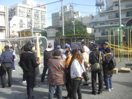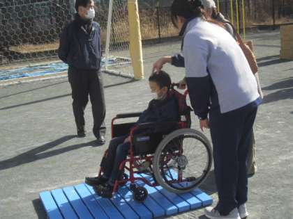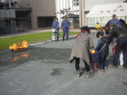 訓練は、各自が興味のあるブースに移動して体験する自由参加型の方法です。初期消火訓練では、本物の炎に向けて消火する体験も行われました。車いす体験コーナーでは、車いすの開き方から実際に乗ったり、押したり等の体験が行われました。