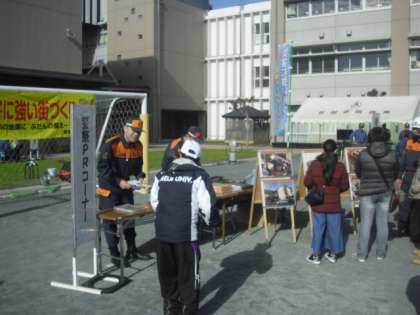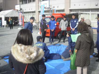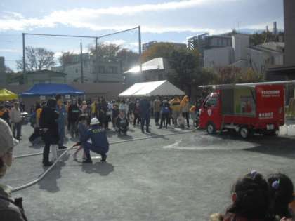 警察のPRコーナーでは、八幡山駐在所の武藤巡査長さんが活躍されていました。応急救護訓練では、消防署の方々による心肺蘇生法やAEDの使い方についての説明と訓練を行っていました。D級ポンプ・スタンドパイプ放水訓練では、子どもたちが実際に放水を行い、貴重な体験をさせてもらいました。