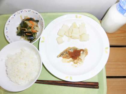 「ごはん、白身魚のステーキソース、粉ふきいも、わかめサラダ、牛乳」です。