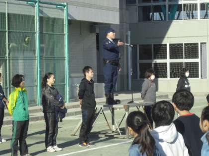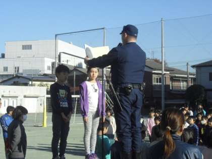 今朝の全校朝会は、八幡山駐在所の武藤巡査長さんにご来校いただいて、子どもたちの生活指導についてお話をいただきました。連れ去り防止や火遊びなどについての注意喚起を中心に、八幡山小の子どもたちが安心・安全に過ごせるためのアドバイスをしていただきました。
