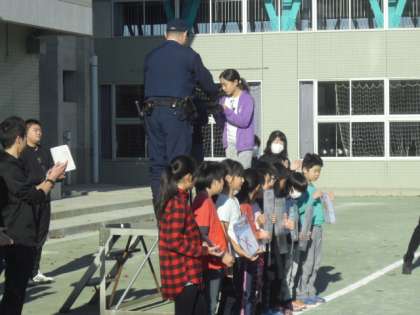 引き続いて、4年生の子どもたちが国語の授業で取り組んだ、交通安全啓発ポスターの表彰を、成城警察署を代表して武藤さんにしていただきました。素敵な取り組みですので、次年度以降も継続していってほしいです。