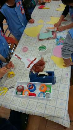 年少さんのお面づくりには、工作のための準備が必要です。のりを使うための「のりした紙」や「お手拭き」を用意して上手に作業をしていました。どんなお面や小道具が出来るかな?子ども会が楽しみです。