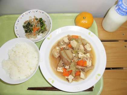 薄味のさっぱりとした「すき焼き煮」でした。配膳を上手にスムーズにできるようになると「温かいもの」は温かく食べられるようになります。