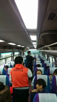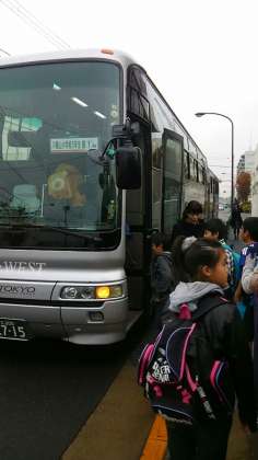 バスに乗りました。5年生の社会科見学では、環状8号線を世田谷区から、大田区、川崎市を通って神奈川県に向かいます。