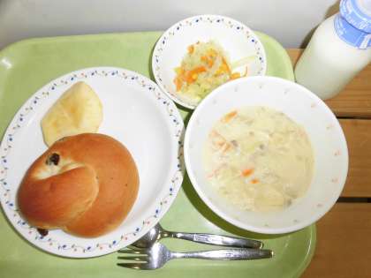 「ぶどうパン、クリームシチュー、コーンサラダ、りんご、牛乳」です。