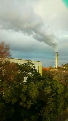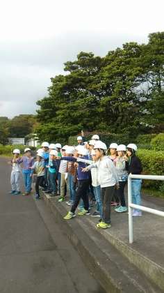 JFE スチール東日本製鉄所では、ヘルメットを着用してバスで見学しました。