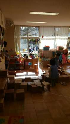 八幡山幼稚園では、行事練習の合間に、沢山遊びを体験します。今日の年少さんの室内遊びは、大型積み木を組み立てたり和室に集まったり、楽しそうでした。