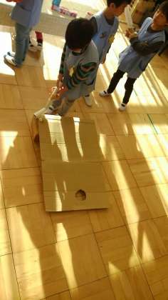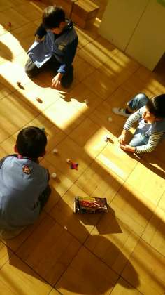 工作で作ったパターゴルフで遊んだり、ペットボトルの蓋で作ったこまを回したり、さすが年長さんです。