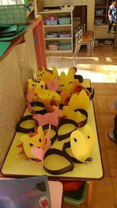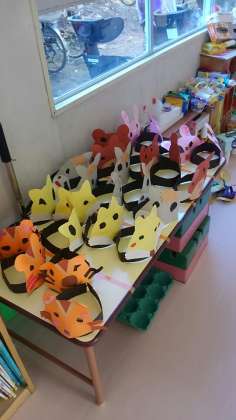 年少さんのお部屋では、こどもかいで使う、お面がスタンバイしていました。リハーサルで年長さんにも、劇を見てもらい自信が付きました。