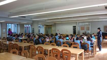 年長さんが、八幡山小学校のランチルームを体験しました。広いランチルームの大きな机と椅子、給食のワゴン車を見学しました。いち早く小学校の様子を知ることが出来ました。