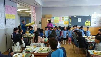 給食の時間にお邪魔して、担任の先生に、模造紙に書いた大きな手紙を手渡ししました。
