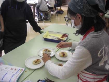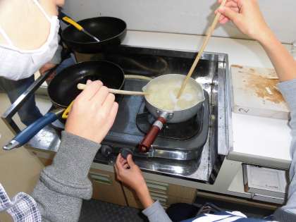 煮たり、焼いたりと調理の仕方はいろいろですが、みんなで協力し、すべての班で無事に料理が完成しました。