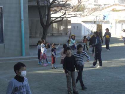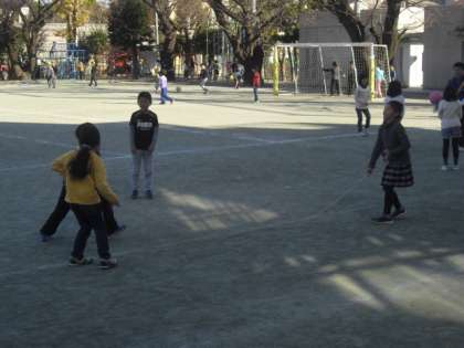 冬晴れの空の下、今日も休み時間は元気に外遊びです。ドッジボールや長縄など、思い思いの遊びに興じていました。その中で、3年3組の子どもたちは、学期末に行うお楽しみ会の練習をしていました。恥ずかしがりながらも、楽しいそうに披露する出し物を演じてくれました。お楽しみ会、とても盛り上がりそうですね。