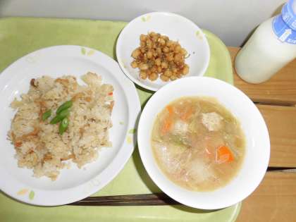 「子ぎつねごはん、大豆とじゃこの甘辛煮、肉団子入り味噌汁、牛乳」です。