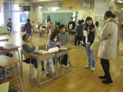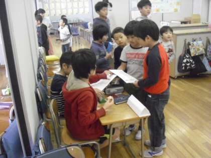 前半と後半に分かれて、各教室のお店を回ります。前半に当番になっている子どもたちはお客さんを迎えます。どの班もたくさんお客さんを呼び込もうと必死です。今回は2学年でペアになって行動しました。