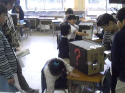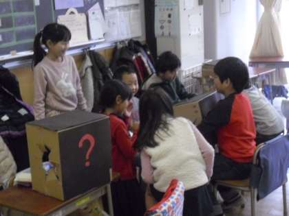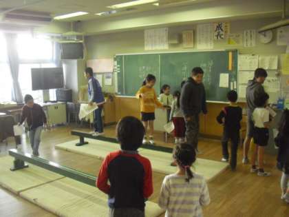 体育館のマットや平均台を持ち込んでの「スポーツテスト」のお店では、子どもたちがいろいろな競技にチャレンジし記録をとっていました。「ミステリーボックス」は、何が入っているか分からないところがハラハラ・ドキドキで、教室内には大きな歓声が上がっていました。