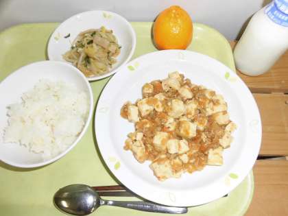 「ごはん、麻婆豆腐、白菜の中華サラダ、ぽんかん、牛乳」です。