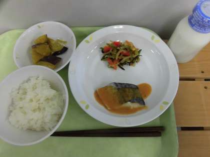 「ごはん、鰆のピリ辛ソース、大根とひじきのサラダ、さつま芋の含め煮、牛乳」です。