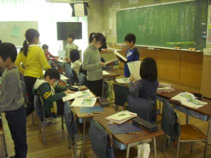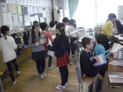 3組の国語の授業は、「南の島へようこそ」の単元で、案内をするときの言葉づかいを考えながら、グループで言い方の練習をしました。かしこまった話し方は、ふだんなかなかでしないもので、相手の気持ちを考えて、どの子も真剣にやりとりをしていました。