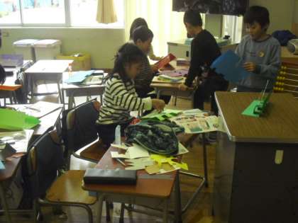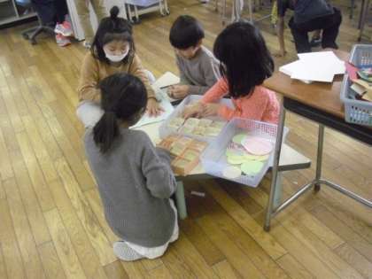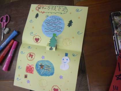 2組の図工の時間は、「ひらくカードを作ろう」の学習。色画用紙を使って、クリスマスカードを作っていました。カードを開いた時に、立体的に見えるように工夫して、もらって楽しいカードを作っていました。みんな笑顔いっぱいで、クリスマスが待ち遠しい様子がうかがえました。