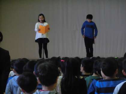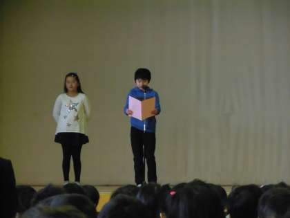 児童代表の言葉は、2年生と4年生が担当しました。この2学期の行事などを思い出しながら、がんばったこと楽しかったことなどについて発表し、3学期に向けての抱負も述べてくれました。