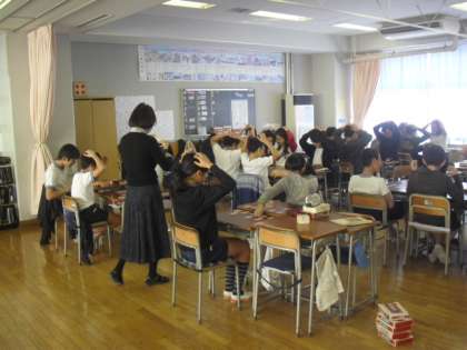 6年生の教科「日本語」の授業は、全員で百人一首に取り組みました。お手つきをしないように、手を頭の上に置いて、先生が読み上げるのを真剣に聞きます。みんな6年間でたくさんの歌を覚えたので、どのグループも勝負は白熱していました。楽しい授業の一コマでした。