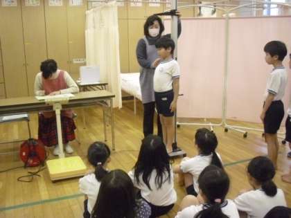 今日は3年生で発育測定が行われました。伸び盛りで元気いっぱいの3年生の子どもたちは、姿勢を正して少しでも身長が伸びていることを願って計測に臨んでいました。