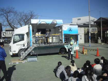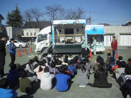 全体での避難訓練の後、烏山総合支所地域振興課の職員の方々のご協力を得て、5年生が地震の体験活動に参加しました。震度7の地震を体験できる起震車に乗って、地震発生時の避難行動について実践的に学びました。予想以上の大きな揺れに驚き、子どもたちは地震の恐ろしさを実感しながら、あらためて訓練の大切さを再確認したようです。