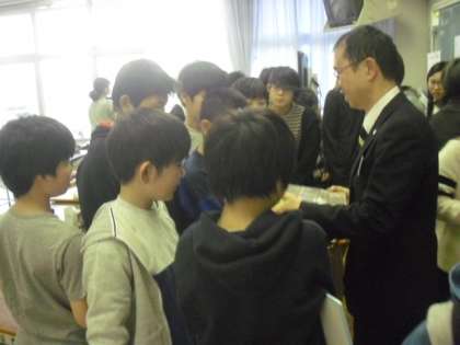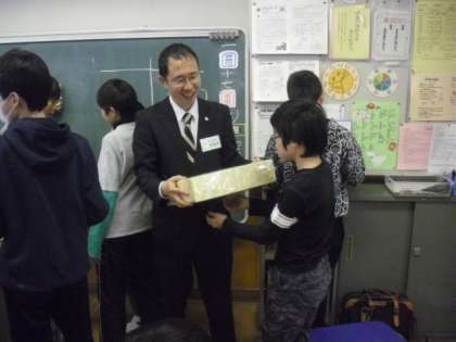 授業の後半では、税理士の仕事についてお話していただきました。子どもたちが将来の職業としてやりがいのある仕事であることや、税理士の立場から、税金の使われ方について今からいろいろと知識を広げていき、政治に参加していく主権者意識をもってほしいというメッセージもいただきました。最後に、見本としてご持参いただいた1億円の札束を紹介していただきました。子どもたちはその量と重さに驚いていました。税理士会北沢支部の皆さまありがとうございました。