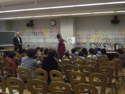 放課後のランチルームでは、学童クラブ・新BOPの子どもたちが集まり、上北沢図書館の方々をお招きして、絵本などの読み聞かせをしてもらいました。本が大好きな八幡山小の子どもたちです。みんな楽しい絵本にくぎづけになって、本の世界に浸っていました。