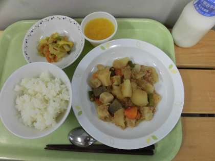 「ごはん、じゃが芋のそぼろ煮、白菜のおかかかけ、みかんゼリー、牛乳」です。