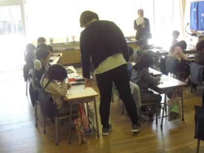 午後の5時間目の生活科の授業では、1年1組の根岸教諭が3年次の研究授業を行いました。午前の昔遊び体験をふり返り、カードに感想を書きます。楽しかったことや教えてもらってできたことなどを思い出しながら、自分の言葉で表現するように、先生は一人一人に声をかけていました。参観していただいた教育委員会の先生から、授業の進め方などについての指導をいただき、根岸教諭は今後も授業改善に励んでいきます。