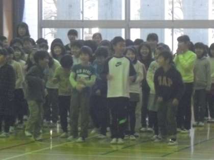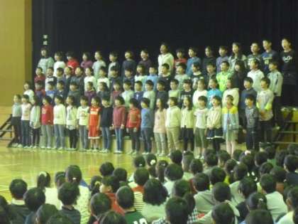 今月の音楽朝会は、4年生が2月に行う「二分の一成人式」で歌う『今は!ほら』を、全校の前で披露しました。身振りを交えた、とても元気な歌声が体育館に響き渡りました。後半は全校児童で、『冬の歌』を歌いました。♪ズンズンズンズンまっ白なみ〜ち♪と、テンポのよいメロディーにのって、3年生の子どもたちのジェスチャーがとても素敵でした。寒さに負けず、この歌のように楽しく1日を過ごしましょう。