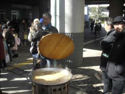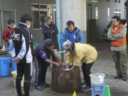 毎年恒例の「あそびばもちつき会」が、ピロティーとランチルームを会場に行われました。連日の寒波による影響で今日も気温が上がらず、日差しはあるものの、とても寒い中での活動となりましたが、朝早くから遊び場運営委員の方々やPTA、おやじの会の皆様など、多数のお手伝いの方々に準備をしていただきました。
