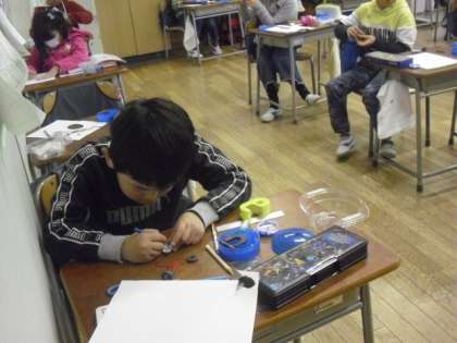 2組では理科の授業で、磁石の勉強をしていました。取り組んだことをカードにまとめた後は、磁石を使ったおもちゃ作りに挑戦です。魚釣りゲームをやるために、夢中で魚の絵を描いて工作していました。みんなで楽しく磁石遊びができるといいですね。