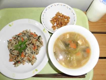 「磯おこわ、鰯のつみれ汁、大豆とじゃこの甘辛揚げ、牛乳」です。