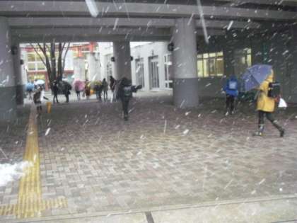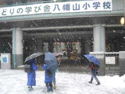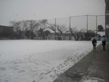 昨夜からの雪が朝まで続き、今朝は雪が舞い散る中での登校となりました。前回よりも積雪は少ないですが、子どもたちは今朝も楽しそうに登校してきました。子どもたちにとって雪は嬉しいはずですが、これで外遊びができない日が続くと思うとちょっと憂鬱にもなります。ようやく乾きだした校庭も、再び1面まっ白になりました。でも、元気を出して今日も1日がんばりましょう。