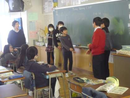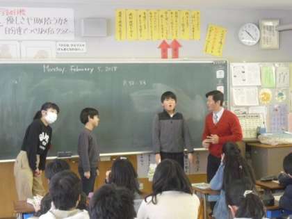 6年生は、普段は英語支援員の野本先生を中心にした英語活動ですが、今日は、急遽ALTのキー先生にも加わっていただき、楽しく英語版「桃太郎」発表をしていました。いつもより少し緊張感のある雰囲気に、発表する子どもたちの表情も、いつになく真剣でした。