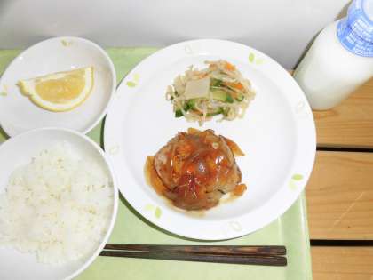 今日のハンバーグにはひじきや豆腐を混ぜ合わせ、鰹出汁ベースの野菜あんをソースに、和風でいただきました。お休みがまだまだ多いですが、今日のメニューはよく食べてくれました。