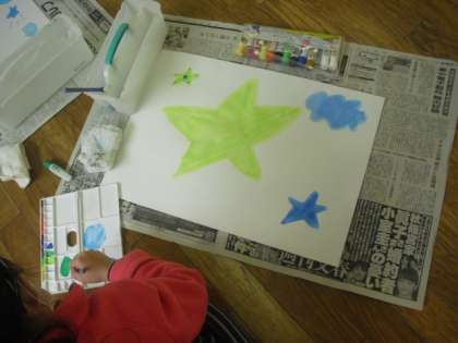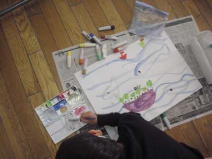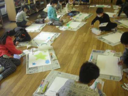 1組では、自分で考えた架空の島を、絵の具を使って描きました。題して『えのぐじま』です。星や雲の形をした島など、カラフルな色使いで楽しく描いていました。できあがりが楽しみですね。