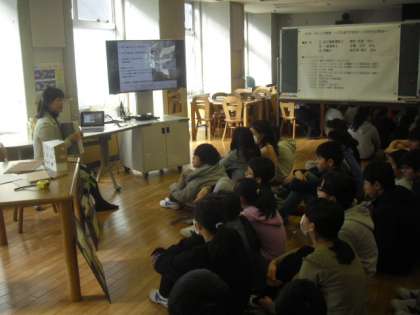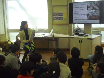 2番目のブースは、一級建築士をしている中澤さんの講義です。建築士の仕事内容や、家を建てるためにさまざまな方とのやりとりがあること、仕事のやりがいなど、映像や資料を使って、分かりやすく説明していただきました。測量計や実際の図面、模型なども持参していただき、子どもたちも関心をもってお話を聞いていました。