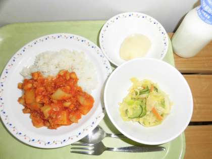 「チリビーンズライス、イタリアンサラダ、りんご、牛乳」です。