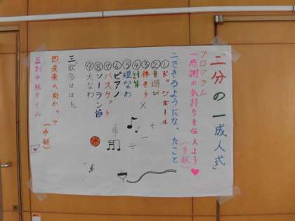 毎年恒例になっている、4年生の総合的な学習の時間の『2分の1成人式』が、体育館で行われました。子どもたち一人ひとりが、これまでの自分を振り返りながら、得意なことやできるようになったことを紹介します。それぞれがんばっていることが披露されました。