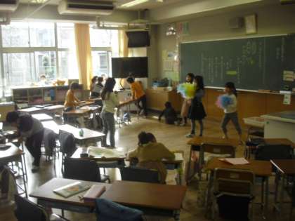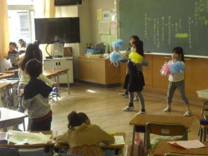休み時間の1年生の教室では、ダンスを練習する子どもたちがいました。メンバー全員が色とりどりのポンポンを使って、息のそろったダンスでした。どこで発表するのでしょうか。